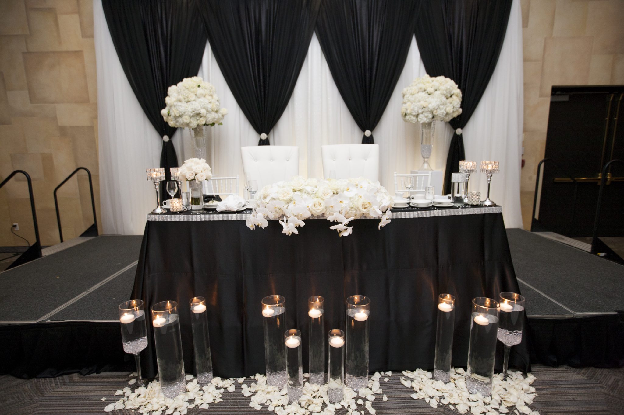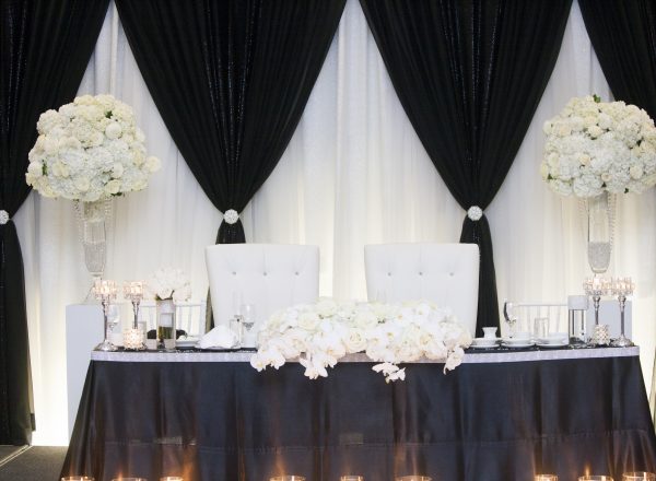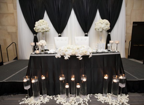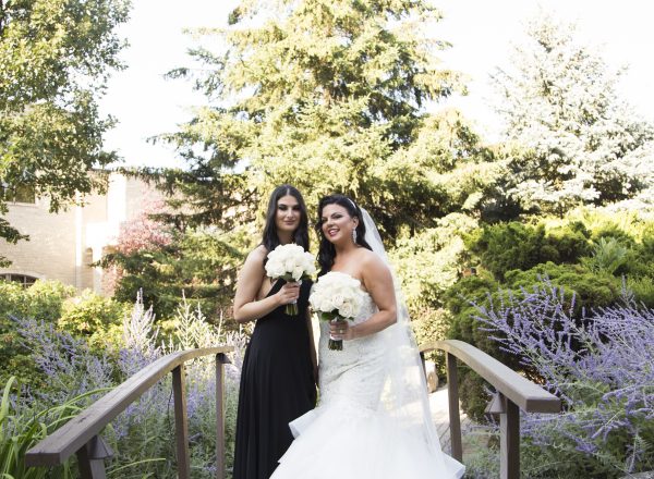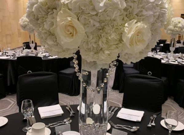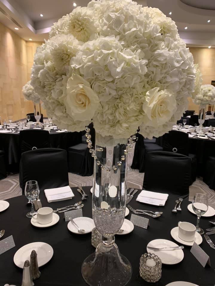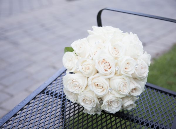Valerie and David chose White Oaks for their Black Tie wedding! Carrying a classic White Rose mounded style bouquet Valerie walked down the aisle lined with a sea of rose petals for the garden ceremony! An elegant reception followed in the grand ballroom….towering centerpieces filled with fragrant Garden Roses and Hydrangea brought a classic look of sophistication!