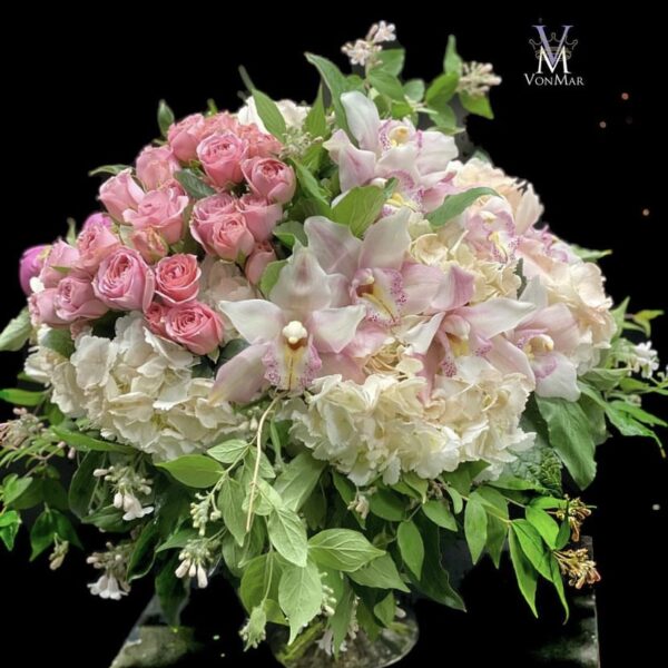 An ethereal design filled with fragrant Garden Roses and Stock, White Lisianthus and Spray Roses…One of our most requested Tribute Designs.