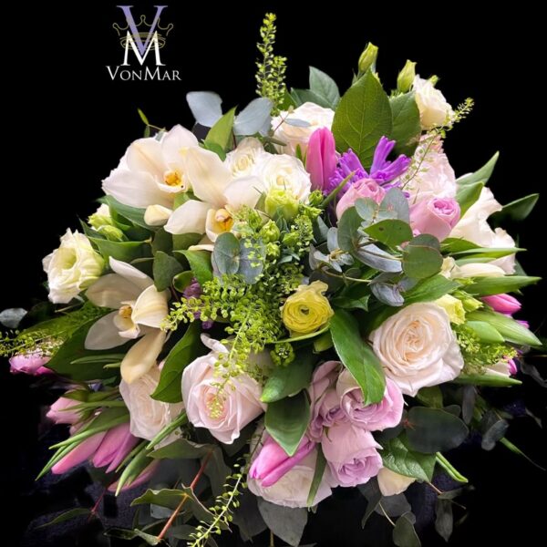 Delightfully feminine…. this design feature Blush Roses and Cymbidium Orchid blooms with White Spray Roses on a mound of Hydrangeas and tinted Baby’s Breath in a striking Pink 5×5 glass cube