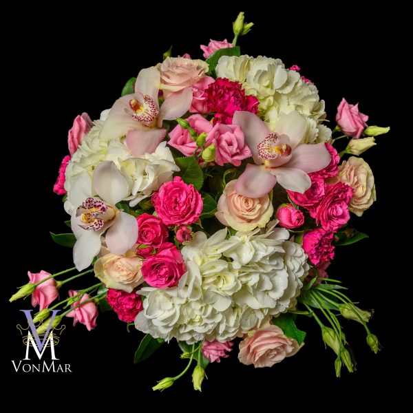 Blush Roses, Ranunculus, and Carnations are surrounding a duo of green Hydrangea and accented with a deep pink Spray Rose and Orchid blooms in a bed of fresh greenery